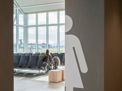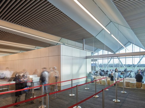 The building modules each face the direction of travel, gradually opening toward the airside into expansive views of awaiting aircraft, acting as passive wayfinding and helping to alleviate passenger anxiety, especially in the security queue. These public circulation paths are reinforced by a maple lined wall running the full length of the new departure lounge. The wall provides privacy for the passenger screening area while also concealing critical building services such as air distribution, garbage and recycling receptacles, and public washrooms.