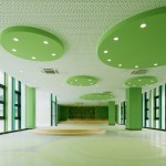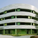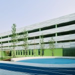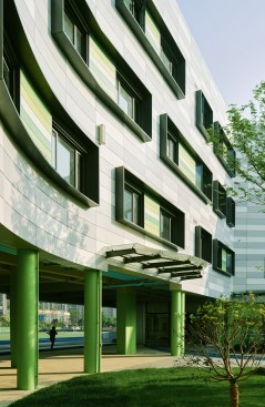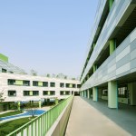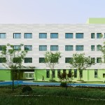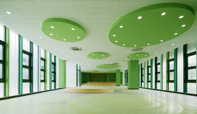 The color concept defines functionally the building. The main exterior façade of the teaching units is composed by aluminum curtain wall panels in four different shades of grey designed to resemble the look and the solidity of a stone wall. The public functions at the first floor and the inner walls at every level above are characterized by a different green tone that outlines the circulation and helps navigating through the building.