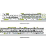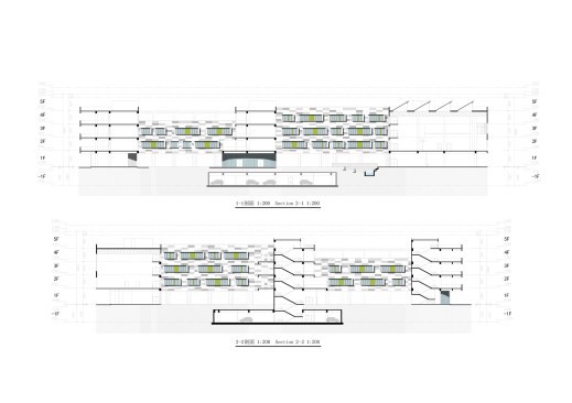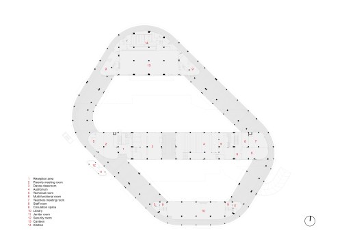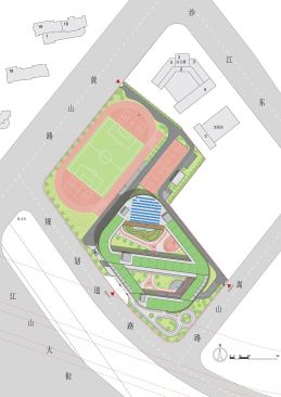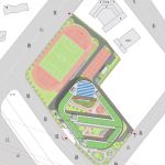 Two large courtyards puncture the volume and separate the three main diagonal teaching blocks, providing sunlight, natural ventilation and generous outdoor space for kids’ activities. The ground floor building’s perimeter is left entirely open, creating a shaded outdoor activity space where a set of running tracks loops around the building and across the yards, connecting the regular sports track and becoming a 1Km long ‘super track’.