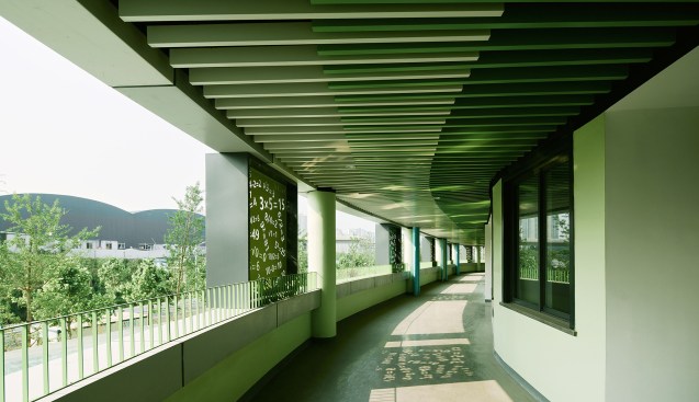 In Hexi Primary School, MUDI adopted an energy-saving strategy tailored to Nanjing’s humid climate. A passive solar collectors system is used to heat the water of the canteen and the kitchen and it is combined with photovoltaic energy generation; rainwater is filtered through a series of landscape features and harvested in underground cisterns whilst the rooftop gardens and the porous surfaces at the ground level help retaining the water runoff. Indoors, natural lighting is enhanced in the sports hall by tubular skylights in order to reduce the use of artificial lighting and meet the illumination requirements for daytime sports. Furthermore, the ceiling of the sports hall is equipped with a vacuum tube solar water heating system. The building adopts full central air-conditioning with an integrated air purification system and heat recovery in order to create a safe, comfortable and environmentally friendly learning environment for the students. These sustainable strategies combine to meet and exceed the green requirements set out in the brief, for a school that is truly rooted in its surroundings.
