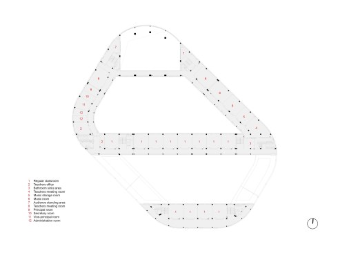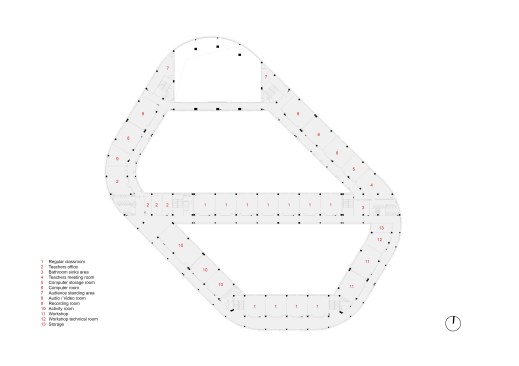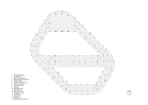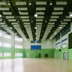 Special classrooms and laboratories are distributed according to their required daylight along the building’s perimeter. The ground floor level hosts the main public functions, with the entry lobby, library, multi-function hall, and canteen easily accessible from the school entrance. Located in proximity of the outdoor stadium away from the teaching units, the head block to the North includes the indoor sports area at the second floor.