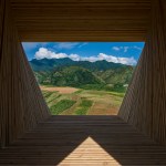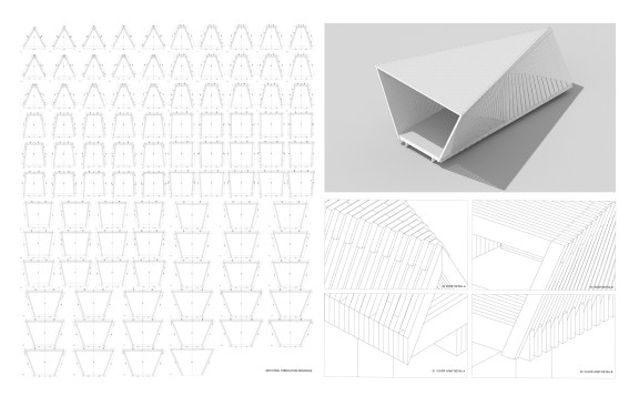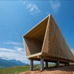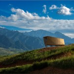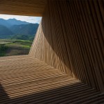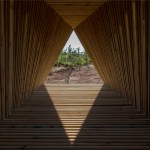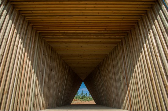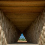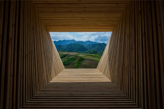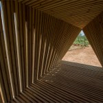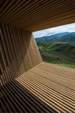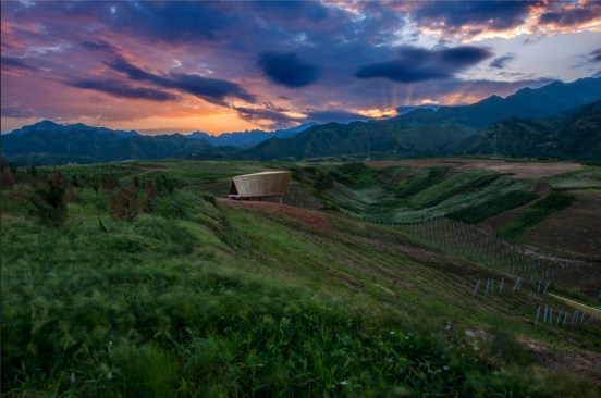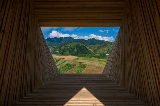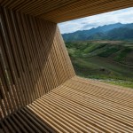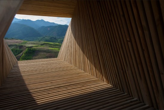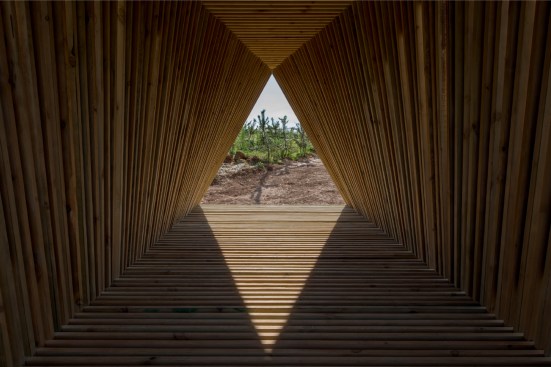 The Napavilion is an intimate yet expansive geometric pavilion designed as an optical device for viewing the rural Lantian landscape. It serves as a small group event space for wine investors and local farmers in the vineyard surrounding a winery. The design of the ruled surfaces of the symmetrical walls, constructed of dimensional lumber, change in angle, density, and pattern, allowing for varied daylight conditions, visual screening, wind baffling, and degrees of enclosure for standing, sitting, or napping. The stepped roof is covered, yet the level floor joists above the ground remain open to below, allowing cool breezes to flow inside and grasses to grow beneath. Supported by concrete columns recalling the slender concrete trellis posts in the vineyard, the pavilion's wooden structure appears to float in the landscape. Formally, the pavilion’s scale, orientation, proximity to the hillside, and degrees of visual transparency both register and intensify the bucolic site conditions.