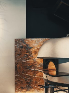 Nappo Pizza Project, designed by Urbanjobs beyond the expectations of a classical space as a response to the concept of a decorative interior integrated with ornamental items, is simply the outcome of design team’s endeavors to create interior spaces offering architectural perspectives. The space created on “moderate, neither few nor much, adequate” theme Urbanjobs tries to implement on its every project, emphasizes the functional aspect of pizza making and the essence of eating. No other redundant detail or ornaments were used other than these. No detail is visible even on the connection of banisters and floor. All suchlike details were solved in advance in the wall and underground layers that are not visible. Marble was used in the spaces desired to be brought forward, a mutual connection was created basing on the process of cooking with this natural stone formed within a thousand of years. For this reason, the furnace was framed with a marble wall at the height of the furnace to highlight the pizza and integrate this context. Other attached walls were designed to hang frames or as a backup for banister.