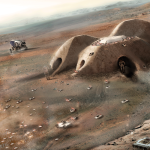 settlement on Mars constructed by an array of pre-programmed, semi-autonomous robots prior to the eventual