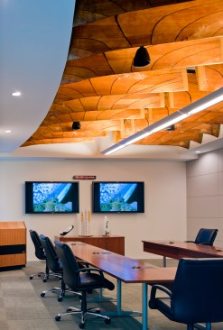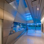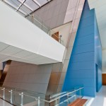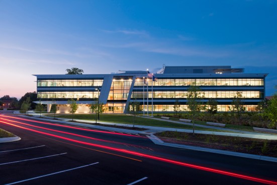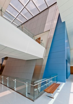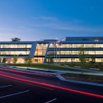 NASA looked to the U.S. General Services Administration to help them plan for six buildings, through GSA’s Design Excellence Program. Cooper Carry was among the team awarded the Design-Excellence Design-Build contract for the first of six buildings. This three story, all glass and metal panel building is the new home for the Center’s Director, her team, and five other departments. The interior will support five state-of-the-art conferencing rooms that will provide real time connection between NASA’s other strategic Centers. In adhering to NASA’s directive to be sustainable along with a required service life of 40 years, our team proposed a better than LEED Gold rating, ultimately achieving Platinum, through innovative solutions that include under-floor air distribution (UFAD) in addition to the bridging design having geo-thermal, photovoltaic (PV) elements and vegetative (Green) roof. The photovoltaic onsite power generation is achieved through two systems; 1) fixed solar panels placed on the penthouse roof, and 2) a photovoltaic film sandwiched between the glazing layers within the building’s massive atrium skylight.