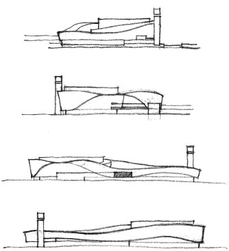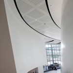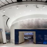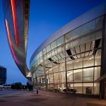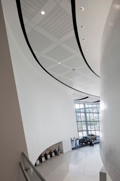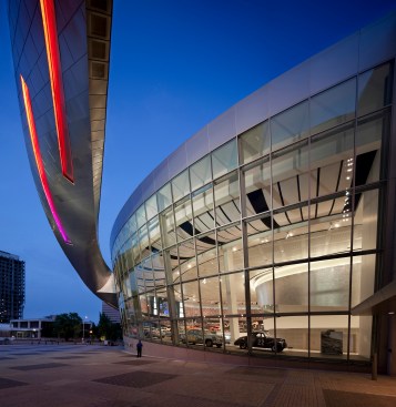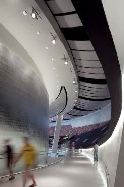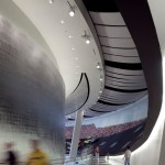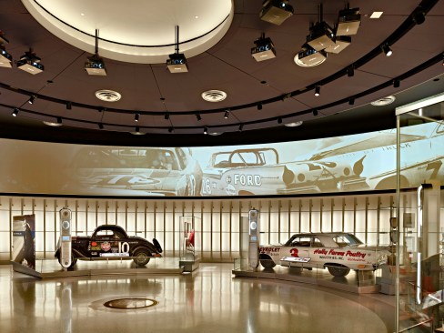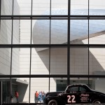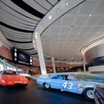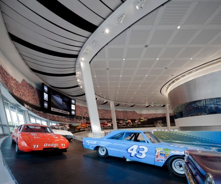 Beginning as a curved, sloping exterior wall enclosing the building, a free spanning ribbon twists over the main entry to form a welcoming canopy. The long, thin incisions in this metal skin are analogous to the blur of a car racing past the spectator at tremendous speed. A large glazed oval forms the Great Hall, the symbolic core of the Hall of Fame, and the primary visitor entrance. In this hall, a curved, banked ramp leads the visitor from the main floor to the exhibit levels above. The ramp contains a display of race cars frozen mid-race, once again capturing the speed and spectacle that is the essence of the sport.