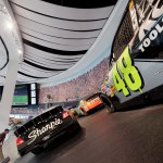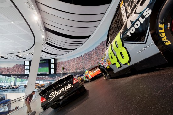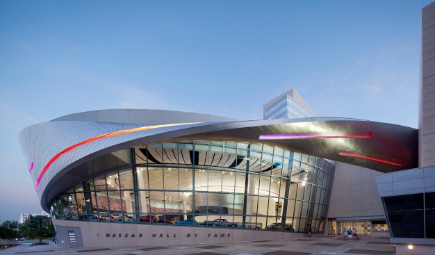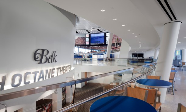 Curving, sloped forms echo the sinuous shape of the racetrack and the essential quality of speed, which is at the heart of the NASCAR spectacle.