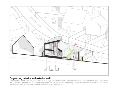 We considered a spatial morphology that did not impose a large additional cost on the project using a simple masonry wall as a cheap and affordable element to simultaneously shape the outer volume and the interior spaces.