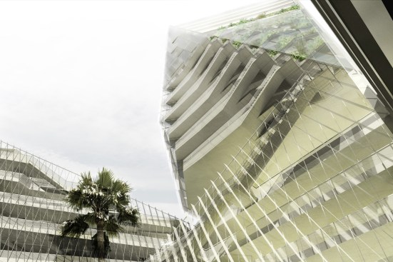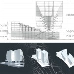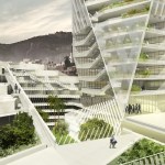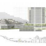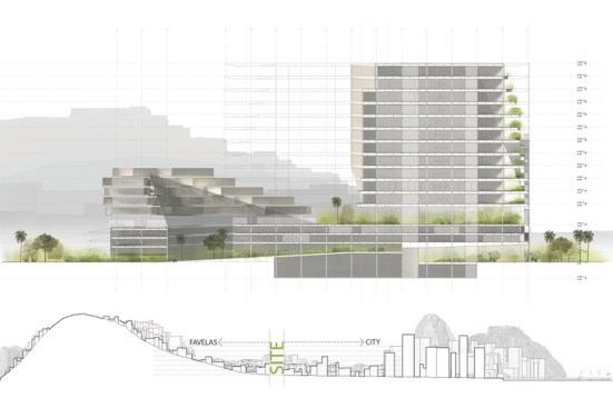 The cost of land and availability of suitable sites in the city demanded a dense, vertically-organized complex. The building section shows how living quarters and public amenities are woven into the structure, never interfering with the hospital operations. Formally the center resembles the character of the city which is defined by the favelas perched on the hills, overlooking city skyscrapers beneath.