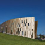 Trespa panel–clad walls. “The subtle change in the size and tonality of the panels might suggest the diversity of people and cultures coming together,” Freelon says.