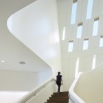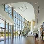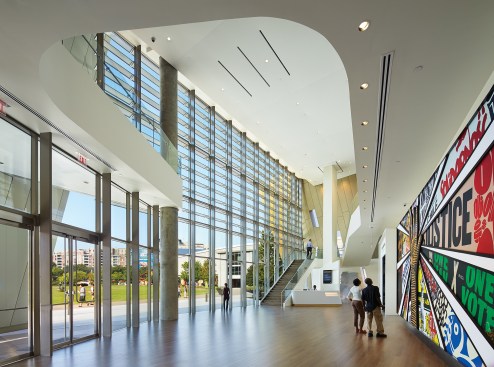 HOK won a 2008 competition for the center in part because of their conceit of a building representing interlocking arms―a symbol of unity and solidarity. “We believe that architectural design, when appropriate, should be representative of the mission of the institution,” Freelon says.