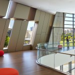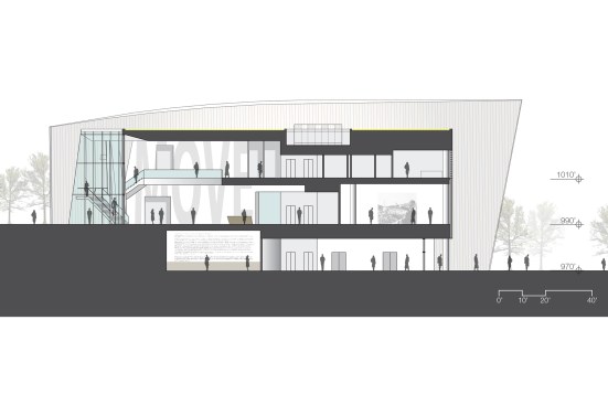 The design as built responds to both the client’s input and the Great Recession (which put the project on hold twice). The 42,000-square-foot building takes advantage of its steeply sloping site with an exterior stair that joins two public plazas. The main, south entrance is on the second of three levels, through a glass façade between two canted,