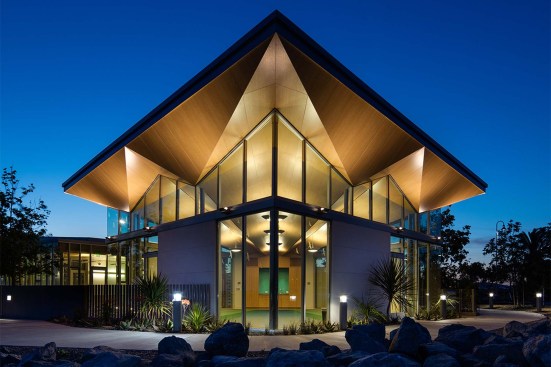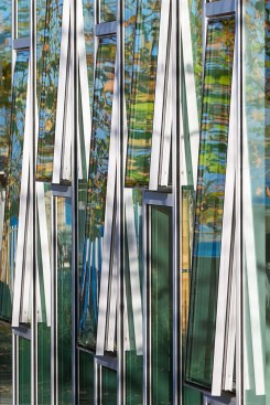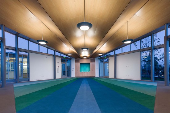 The center’s easternmost structure contains a large gathering and educational space beneath a faceted, flying roof. Perched atop its base of glass walls, the roof appears to float as kite gliding into the air, creating a fluid dynamic for its larger counterpart to the west. Inside, the geometries of a saw tooth ceiling a reemphasized with maple-shaded laminate layered on micro-perforated aluminum. Carpet in ocean shades of teal, turquoise and aqua blues laid in a sunburst pattern accentuates the dimension of the space. Gull-shaped decals applied as bird strike prevention measures cast playful shadows that ‘fly’ through the room as the sun travels across the sky.