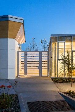 Separate yet unified, the two buildings are enclosed and coalesced with custom galvanized steel gates clad with luminous acrylic resin panels.