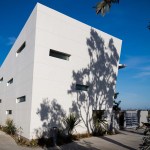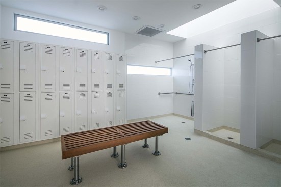 Directly to the west, the center’s offices are housed in a 650 square-foot glass box enclosed with 4-foot intermittently-operable windows. The box introduces a large white, concrete block structure used for boat and equipment storage, locker rooms, showers and restrooms. With outward protruding angles and porthole-like rectangular window apertures, the ship-like edifice ‘flows’ up-channel in the wake of the kite structure that leads it.