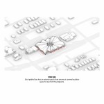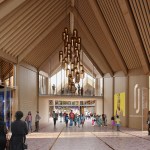 While five street-level entrances allow the galleries and exhibitions to be accessed as individual spaces, two publicly-accessible covered ‘portals’ connect directly to the courtyard and main gallery entrances, welcoming visitors from both the north and the southwest of the site via generous entryways defined by warm, vibrant olors. The mass timber structure that defines the design’s materiality continues into the interior, visually connecting the two realms.