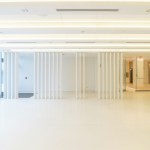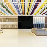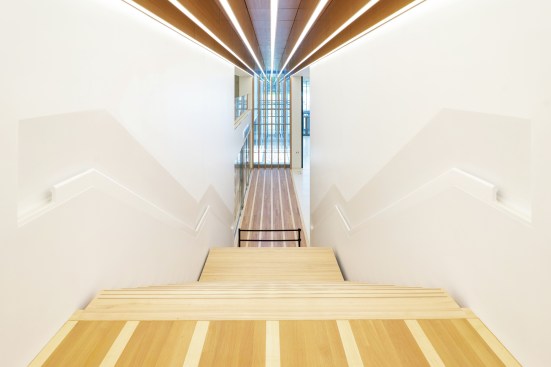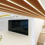 The design of the museum evokes the principles of the Army: it is disciplined, modest, and rigorous. The simplicity and sharpness of the exterior enclosure- made of eighth-inch-thick, rainscreen-insulated panels of stainless steel and minimal glazing- allows reflections to be cast on the facade, transforming the character of the building through every season and time of day. At the corner of each pavilion, recessed glass panels alternate with painted aluminum fins to add a sense of dynamism to the facade. Because the complex itself lies on a three-foot grid system, with every joint and edge of the building falling on these subdivisions with precision, each aluminum fin is spaced 18 inches apart to fall exactly on the edges of the laser-cut panels. The building is organized into five pavilions. designed according to specific interior functions, that are connected by glass thresholds with wood fins to signal transitions between spaces and to offer views of the bucolic surroundings. Each wood fin- made of American white oak and ash- stand 18 inches apart and are embedded with linear LED strips that line up with the striped wood flooring underfoot.