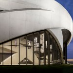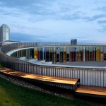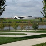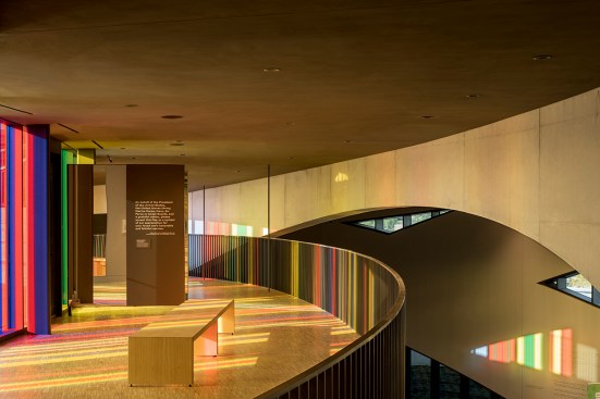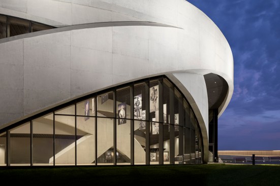 Sited on seven acres of land along the banks of the Scioto River, the design of NVMM integrates and lifts the landscape into a sculpted ceremonial space, forming a processional that culminates in a rooftop sanctuary and amphitheater. Intersecting bands of structural concrete, arranged in three concentric rings, give form to the museum and bind the building to the site, holding the exhibitions. Interactive installations inside the museum convey the shared and individual experience of veterans and offer a glimpse of American military service around the world.