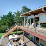 Ferra Designs, in Brooklyn, N.Y., took thin sheets of metal and folded them for use as wall panels. “We wanted [the material] to have functionality and beauty,” Masi says. The designers used a perforated version of the panel on the interior stairwell risers, for a dining room light fixture, and in privacy screens inside as well as on the home’s exterior.