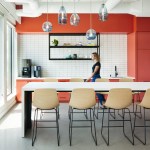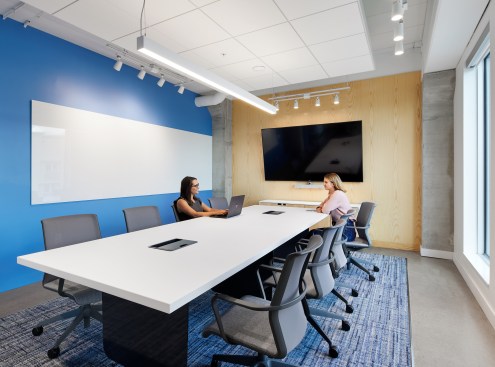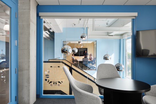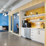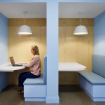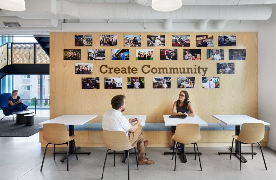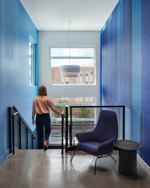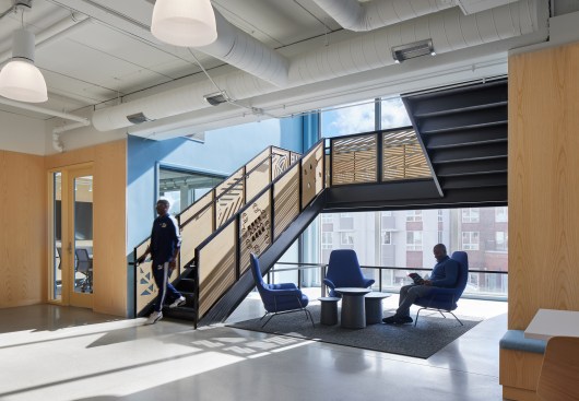 “Walking up the stairs to enter NDC’s new office is a jolt of energy. Bold colors, playful materials and energy greet you as you arrive,” says Vohs. “The space is bright, playful and full of optimism, supporting staff, the community and visitors as they meet and connect together. “