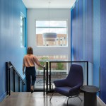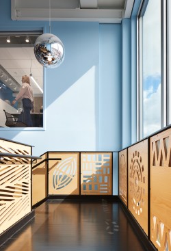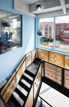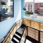 The stair that connects the 2nd and 3rd floor was designed by acclaimed artist Seitu Jones and features patterns cut into plywood and allows light to filter into the spaces from the two story window and atrium. The stair was placed here so the community could connect internally with the NDC space- making the energy of the neighborhood visible to the team at NDC and externally showing the community NDC was here and welcoming them into the building.
