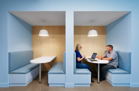The gathering café space folds into two larger meeting rooms that have garage doors so they can support a variety of meeting needs.