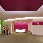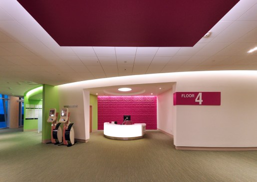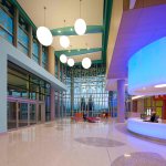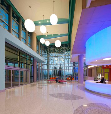 In consultation with Stanley Beaman & Sears, Architect of Record, Perkins+Will led the Clinical Design and Interior Design for the new Nemours Children’s Hospital. The clinical objective was to integrate outpatient and inpatient care into a single facility, to create a patient-centric Model-Of-Care in which the patients care team remains consistent from inpatient treatment to clinic visits, one which allows the team to provide the highest quality of care in a healing, nurturing environment. The overall design of the interior spaces was inspired by the rich garden setting, utilizing design elements of plant life, organic forms, exterior views, and natural lighting concepts to stimulate the senses and allow both children and adults to rediscover the wonders of nature. Upon arrival the “Hospital-in-a-Garden” is immediately evident with the lush landscaping, children and their families are greeted by the “porch light”, an illuminated reception desk that creates a welcoming, comforting environment. Moving past reception along the lobby floor’s garden path in patterned terrazzo, the folded ceiling patterns and artistic cutouts create filtered light patterns that resemble light though a tree canopy. The ceiling “flower” in the Café Dining Room reinforces the connection to nature and ties into the gardens which can be seen from all family waiting areas through floor-to-ceiling windows that allow natural daylight to penetrate deep into the building.Conceptually, the facility appeals to a child’s sensibilities.Playful accents, such as the hedge-like benches that surround “picnic blankets on the grass” dot the waiting areas. Habitable Walls offer fun and comfortable seating options for children to enjoy with their families. The bright colors of the finishes and accent walls provide a full spectrum of color against a neutral field, like flowers in a garden, and avoids the Children’s Hospital cliché of cartoon images and over stimulated patterns.The interior environment is carried beyond the public lobbies, atypical of many hospital designs, and extends to the patient corridors, staff lounges and Patient’s room. Even the restricted corridor of Surgery (typically a lightless, basement environment) is bathed in natural light from floor to ceiling windows, which again provide views of the gardens.Each patient room offers floor-to-ceiling windows for plenty of sunshine and healing landscape views as well as furniture that allows for family comfort. The “Paint Your Room with Color” concept lets children customize their own space. They can modify their environment by painting the space with colored LED lights. This choice of color translates to the exterior and creates a mosaic of patient personalities at night while adding a dynamic quality to the architecture.Creating a sustainable facility that embodies the latest technologies for patient centered equipment and overall building performance with respect to climate, safety concerns, and energy optimization, was a major challenge for the Design Team. Designed to achieve a LEED certification, The Children’s Hospital employs a number of sustainable features. Natural day lighting and views are maximized in both clinical and public spaces while exterior sun shading mitigates heat gain and glare. Healing gardens and roof terraces provide respite to patients, families, and staff and offer a therapeutic environment that inspires holistic healing literally integrating exterior and interior environments.