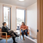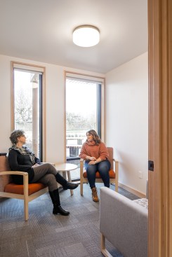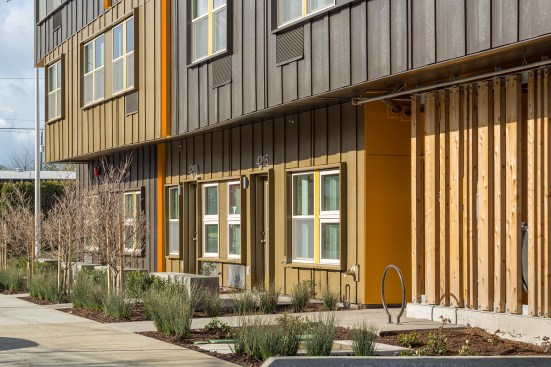 Inside, the design team tailored the wood-framed project to formerly unhoused residents and those in recovery from addiction, designing wellness rooms for private counseling and an airy community room on the ground floor. Accordion doors in the room blur the line between interior and exterior, emphasizing a connection with the outdoors. The team organized the community areas carefully, placing the resident services coordinator’s office near the front entrance. “We were trying to create spaces where the resident services coordinator has to engage with the tenants as they come in,” Arana says. One of the questions was, “How do we create a space where folks are constantly seeing each other, running into each other, talking to each other, and communicating with each other?”