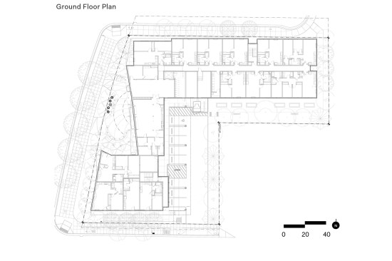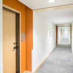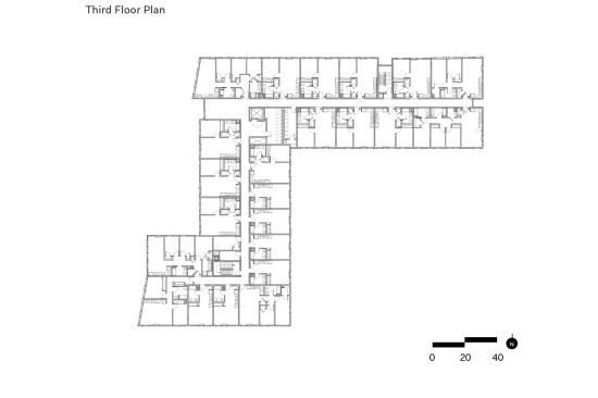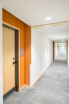 On the upper floors, birch-panel signs with room numbers adorn the individual units, which cater to intergenerational families. The design team included the framework for communicating doors between multi-bedroom units and neighboring studio apartments, allowing for an easy connection between adjoining rooms.