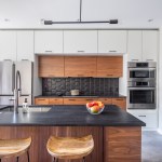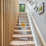 Two bedrooms / two bathrooms and a kids’ den are located on the second floor. A custom stair from the second floor to the third is made up of solid white oak boards that both support each floating stair tread, as well as form the third-floor guardrail. A skylight above allows for the interior of the space to be naturally lit. A home office with wetbar is adjacent to the roof deck, providing excellent access to the north facing / shaded deck for morning coffee or evening cocktails.