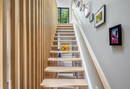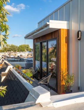 The original 1925 brick rowhouse was completely reconstructed and expanded. The front façade and porch were retained to preserve the character of the street. A third-floor addition, for the principal suite and home office, is setback from the existing roof line, creating a private roof deck. The lower cellar level was fully excavated with a new entrance to access the accessory dwelling unit / rental apartment. The addition is clad with a combination of standing seam metal, nickel gap cementitious siding, and thermally modified cypress. Large glass doors, with high performance glazing, bring in abundant natural light while minimizing solar heat gain.