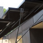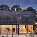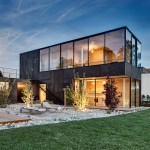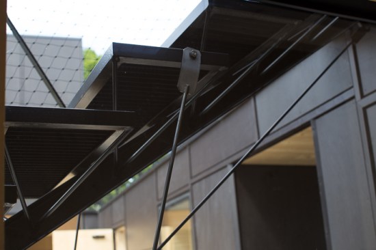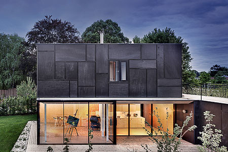 The facade is formed as a Japanese ornament with a black belt and Okume boards, which blur with the large, north-side primarily openings. In some places the height of the openings extends to the top of the building itself and dematerializes in this manner.