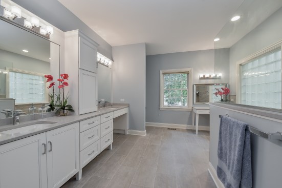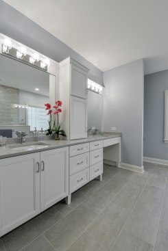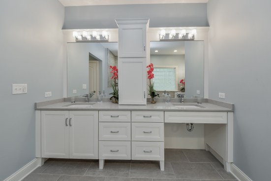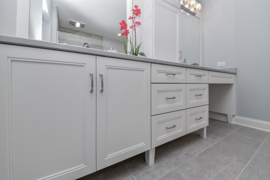 Our client was in an accident and as a result will be using a wheelchair in the future. Which made the current master bathroom layout an obstacle course that was hard to navigate and required more effort than needed. Everything seemed too tall, like the vanity heights, mirrors, and even the shampoo niches creating challenges every day. To reduce stress and make their life easier it was time to remodel this entire master bathroom prioritizing accessibility, function, and aesthetics. 1. Removed the whirlpool tub so that we could better utilize the floor space for a larger shower and access in and out of the shower. 2. Existing shower had a bench seat, shower door, and threshold that impeded the mobility of the owner. The new shower was curbless, so they could wheel in without transferring to a different chair; removed the bench seat for additional space within the shower so it wasn't so tight; and removed the shower door for ease on entry & exit. 3. Placed shower valves at the entrance of the shower, versus underneath the shower head. This way they could turn on water without getting wet in the process. 4. Vanity cabinets: removed existing cabinetry and redesigned with careful attention to wheelchair & seat height, owners reach, and what was the new "eye level" standard for mirror height. All with keeping the cabinetry looking like a piece of furniture vs. something you might find in a healthcare facility. 5. Removed the door trim off the entry into the Master Bathroom, widening the opening enough so no fingers were pinched, or door trim dented getting the wheelchair through the space. The result is a beautiful master bathroom at first glance. Then after further review you start to see the little details that make it specific to our client. First, we removed the large tub and installed a curbless shower allowing our client more room to maneuver in and out of the shower freely in her wheelchair. We also moved the shower valve to the knee wall allowing her to turn the water on without getting wet. The shampoo niche was also built to her specific height. Second, the vanity sink was difficult to reach. We removed the cabinet allowing her to roll right under the sink in her wheelchair making it much easier to use. With the extra space from the tub removal, we were able to build her a separate make-up area. The countertop is specific to her chair height, outlets were installed inside the drawers making it easier to plug in hair tools and other items. Lastly, the door opening to the master bath was too small. It was difficult getting her wheelchair through the opening. We widen the door allowing her to easily roll right in! The client was very involved in the entire process, so they were delighted by the end result. First and foremost, it was a functional success with all their obstacles now gone. Out client may now enjoy her new space on her own without requiring help.