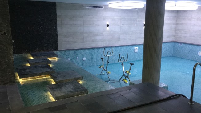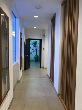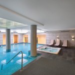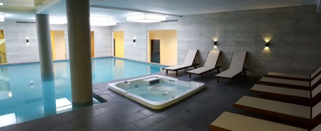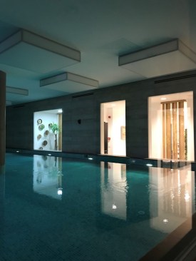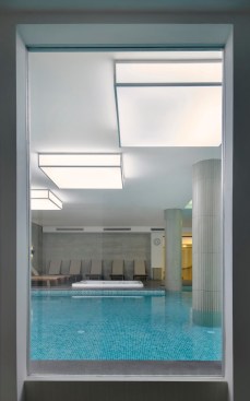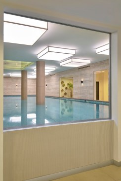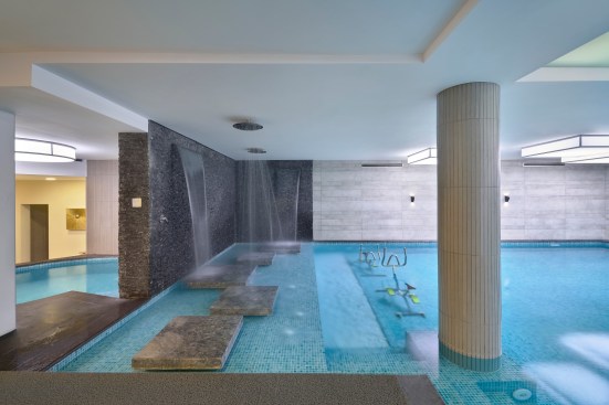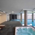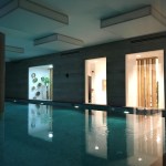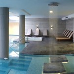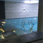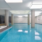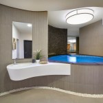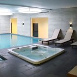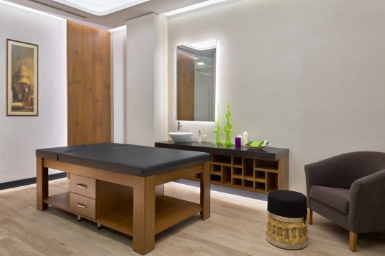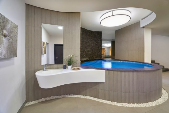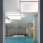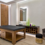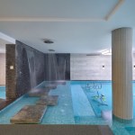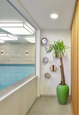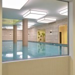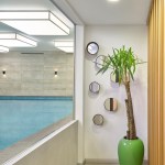 According to all the space functions, walls were covered with ceramic, natural stone and mosaics in pool and spa area. On the other hand, the massage rooms’ walls were covered with textile based wallpapers. The use of soft colors in earth tones as well as the concrete colors were helped to achieve more spacious spaces in such kind of a functional interiors.