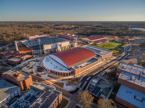 At 225,000 square-feet, the state-of-the-art arena seats 9,500 fans. In addition to the basketball court, it features locker room suites for players, athletic coaches and officials. The complex also includes first class amenities such as a private student concourse, courtside and baseline seating for students, three premium club areas – the Courtside Club, the All-American Club and the Pavilion Club – more than 1,700 premium seats, and an intimate seating bowl.