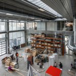 The building was completed with design-integrated solutions and the intention of maximizing spatial flexibility. A narrow material palette reduces the building’s construction resources, including local production and transportation chains where possible. Settling on concrete as the optimal solution when responding to the need for large-scale and resilient spaces, the team behind the project worked closely with the manufacturer to lessen use of material in the construction as well as to maximize use of recycled material. Furthermore, the manufacturer was obliged to work with sustainable production encouraging zero-waste production.
