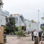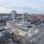 Other sustainable initiatives are the upcycled wood floors made from leftovers from industrial window production and the large library structure spanning several floors. The library is partly made from an upcycled shelve system from a near-by historic building. The urban landscape surrounding the building is part of a research project aiming to upcycle leftover construction materials from building to landscape, testing climate adaption solutions and moving biotopes from one location to another. The school will reduce their energy consumption with up to 50 % compared to the sum of their former locations.