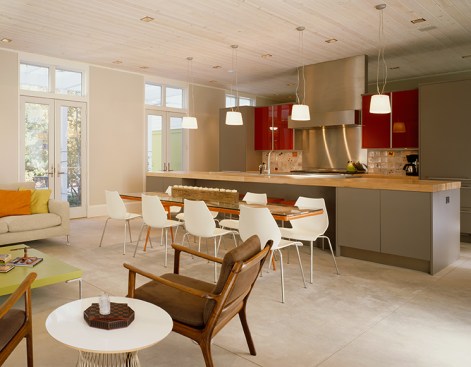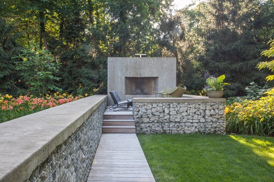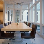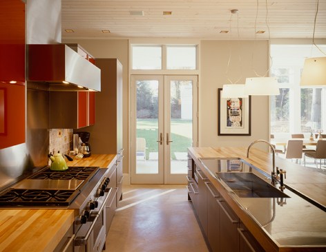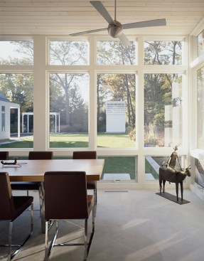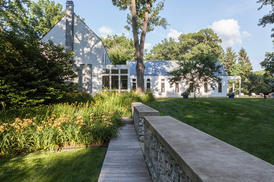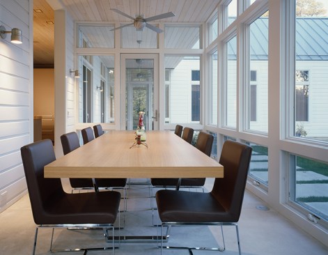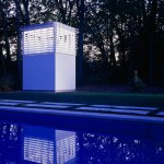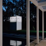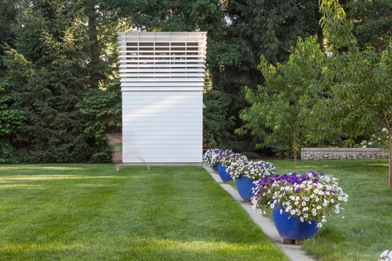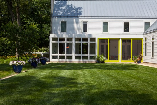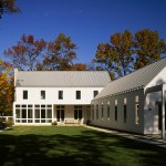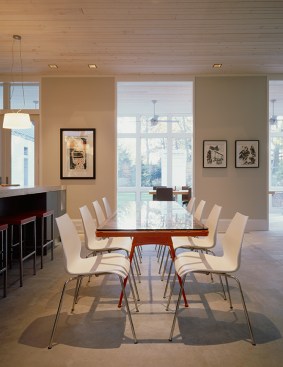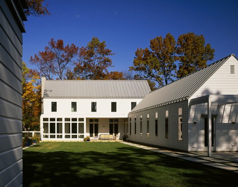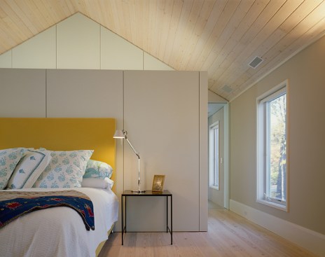 Located in southwestern Michigan, this two-story family retreat was conceived of as a series of prismatic volumes recalling traditional archetypes. The volumes are configured on the site to create distinct surrounding outdoor spaces. Connections between the volumes are purposefully discreet, promoting the perception of independent buildings in the landscape. Rigorous modern notions of rhythm and detailing are combined with vernacular language to produce a nuanced, multivalent understanding of “home.” Interiors are intentionally left casual, with concrete floors & pickled wood finishes. The light, muted palette of the house is juxtaposed with moments of intense color and texture via furnishings and millwork components. Children’s notions of adventure are satisfied with sleeping lofts, secret bedrooms, and a “tree-house” atop a freestanding two-story structure that anchors the corner of the formal lawn. This same structure also houses pool equipment, a potting shed, and acts as a Chinese lantern, glowing in the evening landscape.