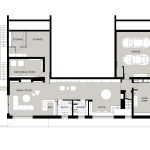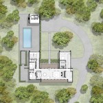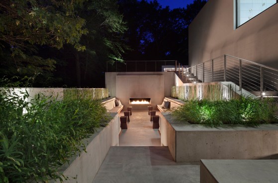 The upper level features the home’s primary gathering spaces, as well as bedrooms and a gymnasium. A staircase tucked behind the free-standing fireplace opens on to the lower level of the house, which is carved into the earth and gives views directly onto the forest floor. The lower level provides additional social spaces and features a media room, library, and two home offices. The lower level spaces link to a series of “outdoor rooms” that feature a fireplace and distinct seating areas. The grounded, cozy nature of the lower level provides an experiential contrast to the expansive and light-filled level above. The swimming pool and separate pool house emphasize the project’s strong lines and classically modern roots.