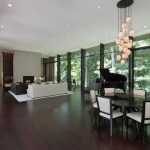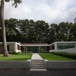 The New Canaan Residence welcomes its owners and their visitors into what feels like a floating pavilion in the tree canopy. A winding drive brings visitors through the forest to arrive at a low and gracious landscaped court that frames the glass entry pavilion. From this court, the transparency of the house is evident: floor-to-ceiling glass allows views through the house, incorporating the landscape into the body of the house. The tree canopy becomes a part of the architecture and creates a visual perimeter that changes with the seasons.