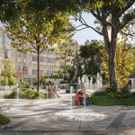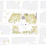 This competition proposal for the redesign of the townhall square of Farsala, a small provincial city is central Greece, draws inspiration from the centuries-old history of the city and the wider area, which has diachronically been an important passage between the north and south of the mainland. Through its 4000-year history, the area has faced multiple and important military conflicts as a battlefield for ancient Greeks, Romans, Ottomans, and modern Greeks. At the same time, Farsala is considered the birthplace of Achilles, the mythical Iliad hero. Achilles’s figure is not only the epitome of the unbeatable heroic warrior, but also connected with the turbulent transition from the old era of heroes to the upcoming era of the city-states. Inspired from these historical facts and mythologies, the proposal employs the concept of ‘conflict’ and depicts it in the paving design of the new square. Multiple clashing square-shaped parts whose geometry affects one another shape a paving that initiates from the entries of the square and leads to its centre, where the proposal suggests to reposition Achilles’s statue, alongside the central floor fountain. The initially square-shaped parts are each time reshaped as a result of the clashes between them. These reshaped parts consist of a zone of exposed concrete at their perimeter, while their inner segment of sequential parallel zones of local stones and marbles that are either new or recycled from the site. The flowerbeds and the floor fountains follow the same design logic. Small bumps with trees and low vegetation shape the flowerbeds that surround the central part of the square forming a garden, which aims to advance and enrich the microclimate of this public space. The multiple floor fountains placed at key points of the garden enhance the presence of nature in the square offering moments of play and surprise. The floor fountains at the central part of the square and at the garden are concealed in the paving. Brass ribbons designate the drainage zone of the fountains, an area that appears as a continuation of the paving. Water surprises the visitor of the space by jumping out from the nozzles concealed in the paving, and it either creates an ephemeral shallow pond, or drains directly using the nozzles drainage system. The design of the lighting fixtures as brass bells refers to the Byzantine history of the area, while timber and marble seating equipment is positioned in a way to follow the paving pattern.