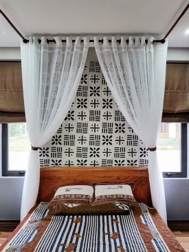After choosing the kind of split stone, he hired the sawmill to make small 3-4 cm pieces for the area around the house. Brick ventilation creates a charming façade and attracts attention in the living room area. The young architect chose a wood asphalt floor that can resist water, fire, termites and sap. The house is airy, with lots of light, thanks to the windows and brick ventilation. Bedrooms in brown-white tones and decorative tiles are warm and light in color, and romantic. The familiar materials used with a sophisticated design has attracted the attention of many people in Quang Binh.