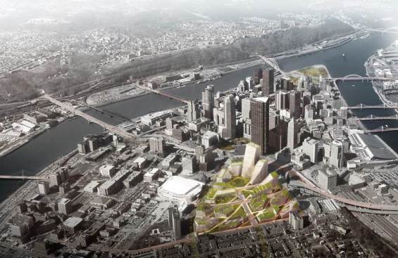 public spaces at the 28-acre Lower Hill District of Pittsburgh. Building