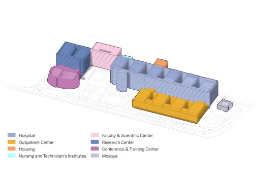 The New National Cancer Institute will be located on a gently sloping, 35-acre site in Giza’s Sheikh Zayed City, situated approximately 17 miles west of central Cairo. In conceiving the campus, SOM considered the client’s multifaceted vision, phasing flexibility, and the region’s climate simultaneously. The result is a unified system of functional modules (i.e. in-patient, out-patient, and research) organized among landscaped courtyards and connected by discrete visitor and staff circulation spines. These circulation spines also provide patients, visitors, and staff with access to a network of amenities that includes cafes, lounges, prayer rooms, retail, pediatric activity areas, and daycare. Staff circulation deserves special note, as this corridor efficiently traverses the entire campus while fostering informal and spontaneous interactions between colleagues and students: It exemplifies the overall organization system’s goal of creating both authentic cohesion and orderly separation for the campus.