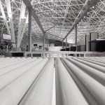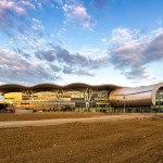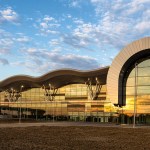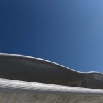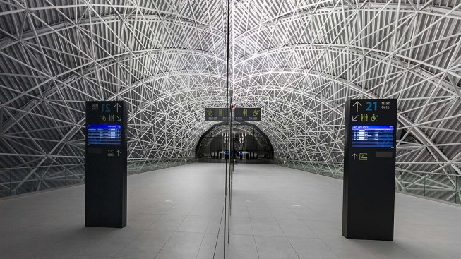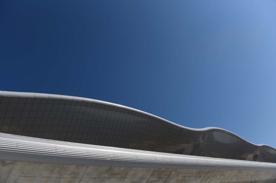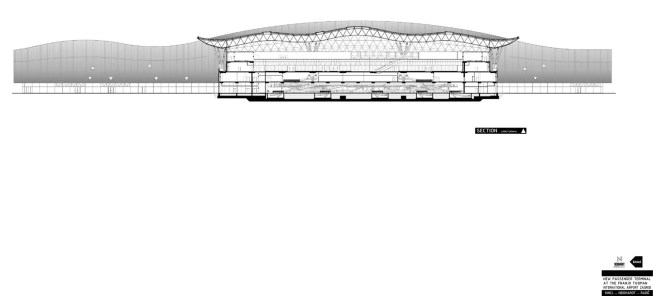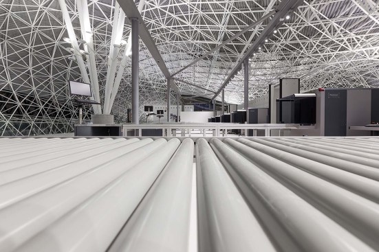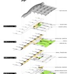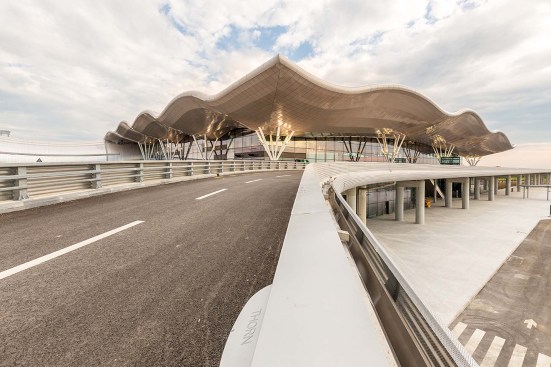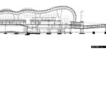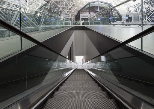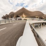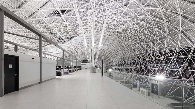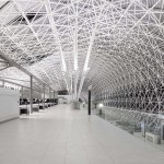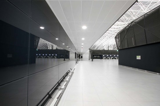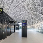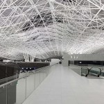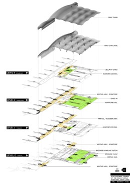 Three levels of reinforced concrete structure form the terminal’s base. A dynamic roof envelope, which unwraps itself to levitate above the terminal hall generates the free dynamics of the structural net—an iconic expression of the landscape and its relief features as original attributions to the generated architectural form. The envelope structure is a spatial truss curved in two directions deploying tens of thousands prefabricated steel tubes and nodes based on the triangular off-grid module.