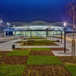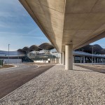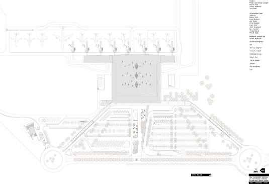 The landside surroundings spatial organization allows the dominance of a pedestrian esplanade in the middle. The traffic functions between two traffic roundabouts. They serve as connecting points to viaduct ramps leading to or from the departure level curb at 10.20 m above the ground.