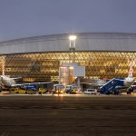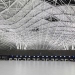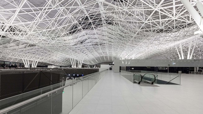 Flexibility of conceptual scheme allows for adaptability with open spaces formed by predominantly 14.40 x 4.40 m modular column grid at the concrete base. Above, dynamic space frame structure forms the top of the departure hall borne by the closed-umbrella-like pillars on the floor plan grid of 28.80 x 43.20 m. The pier design allows for the flexibility that is necessary to sustain the expected increase of air traffic in the future.