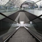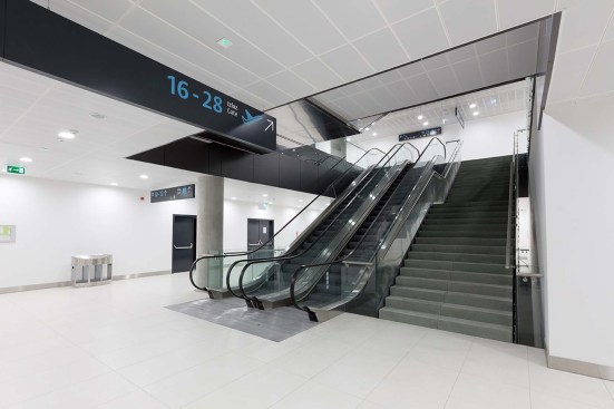 Main public levels at the landside of the terminal and the ground and upper departure levels are connected by outdoor escalators and elevators, and by interior sets of elevators and stairs within circulation cores.