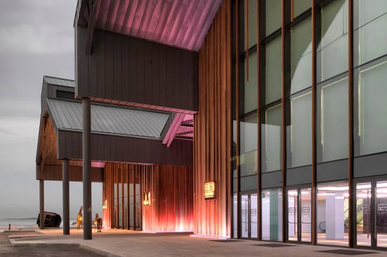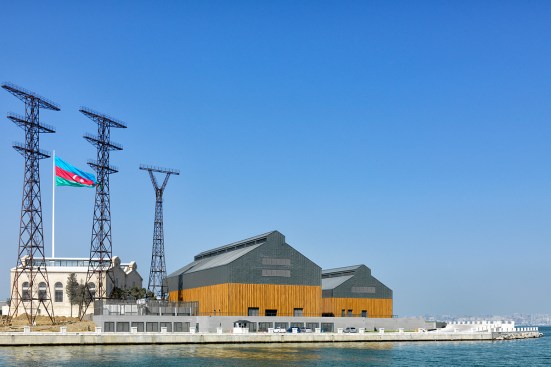 The original brief asked the architects to demolish the old, late-19th century power station located on a natural harbour in the Bay of Baku, and build a new events hall in its place, but after a site visit, the architects proposed two new buildings linked by an enclosed bridge to house event spaces, while preserving the old power station as an exhibition space. The resulting New Power Station references the old through its placement and form, and the courtyard outside connects the former industrial site to its surroundings, the expanding green zone on the city’s waterfront. The design, with a simple geometric mass, use of zinc and wood for the large sloped roof and the facade, reflects the industrial spirit of the site and enables it to serve as a flexible, multi-functional space. The restaurants, jazz club and the concert area all have access routes to each other to form a dynamic circulation between the two buildings. The New Power House design reflects what defines an industrial building in the collective memory and yet has a contemporary style as well.