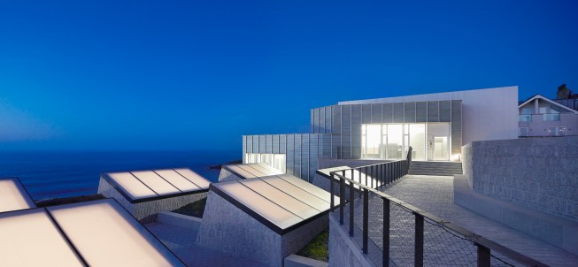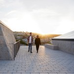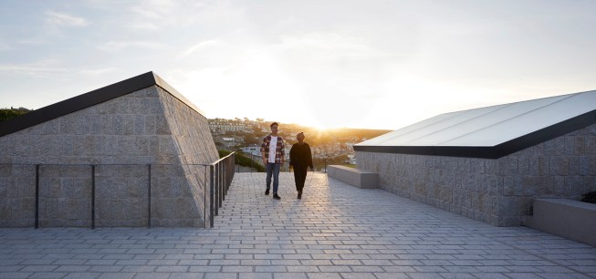 The exposed roof and the light chambers of the submerged gallery provided an opportunity for us to create an additional element to the project that was not in the brief. The roof is treated as a continuation of the landscape of the Cornish coastline. A gentle set of stairs and public spaces weave between the elevated granite volumes of the light chambers amid Cornish wildflowers, meeting an existing path which leads to the sea.